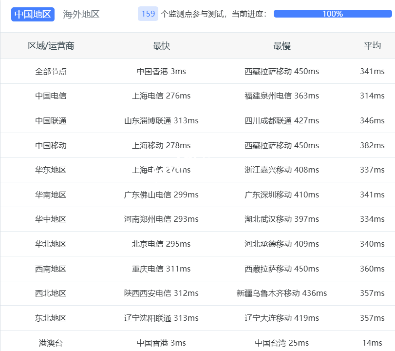 中国香港 187.74Mbps 184.27Mbps 3.30ms