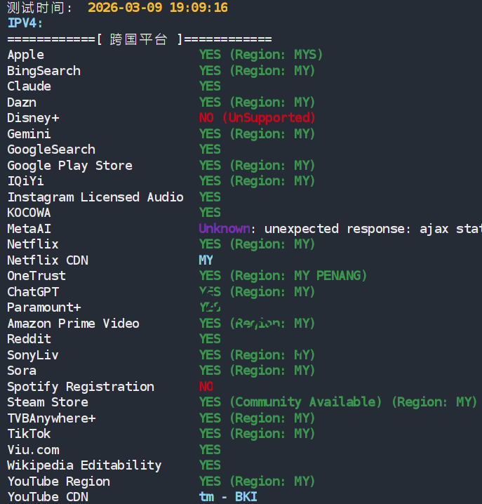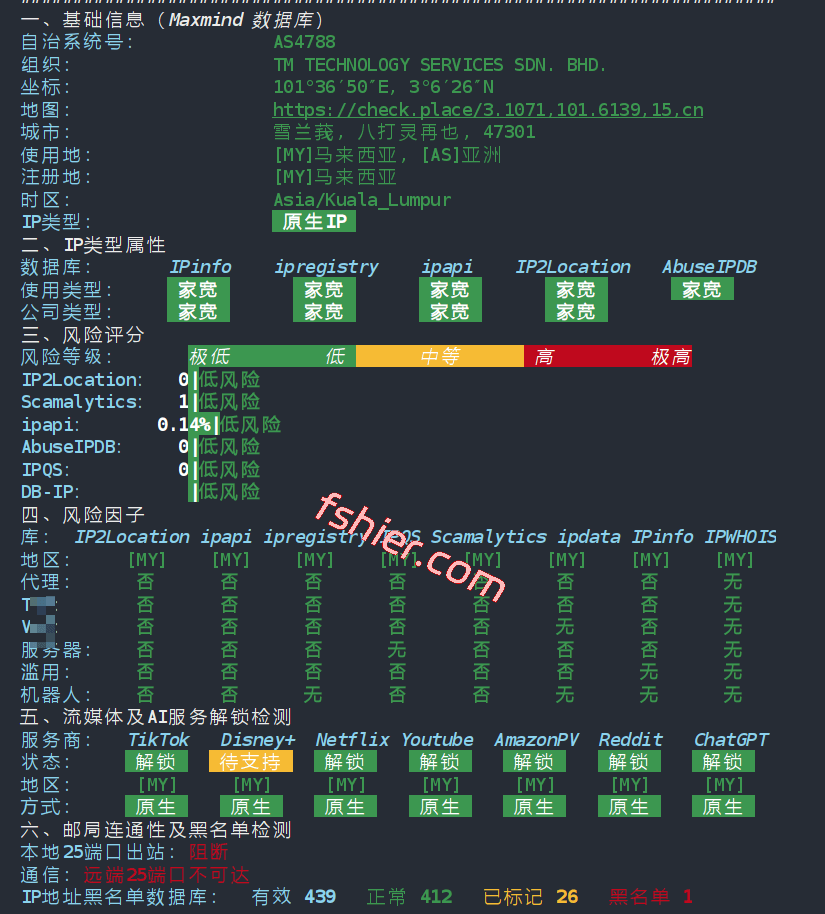 马来西亚原生IP,多数据库显示双ISP属性,解锁能力不错。