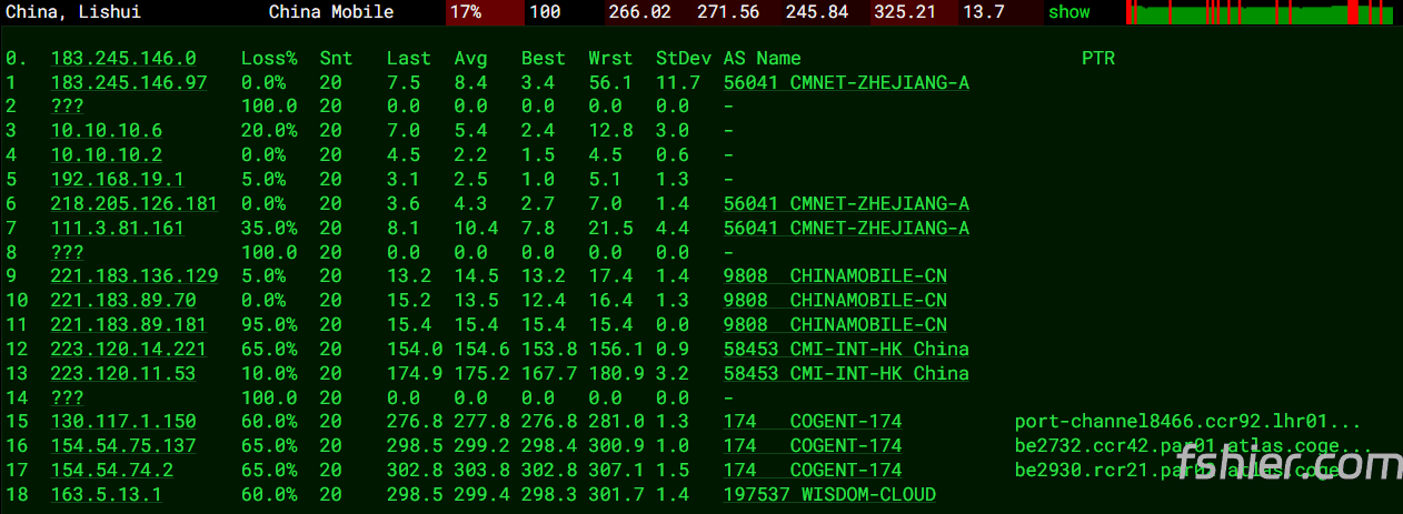 14 261.09ms 223.120.*.* AS58453 [CMI-INT] 中国 上海 cmi.chinamobile.com 移动