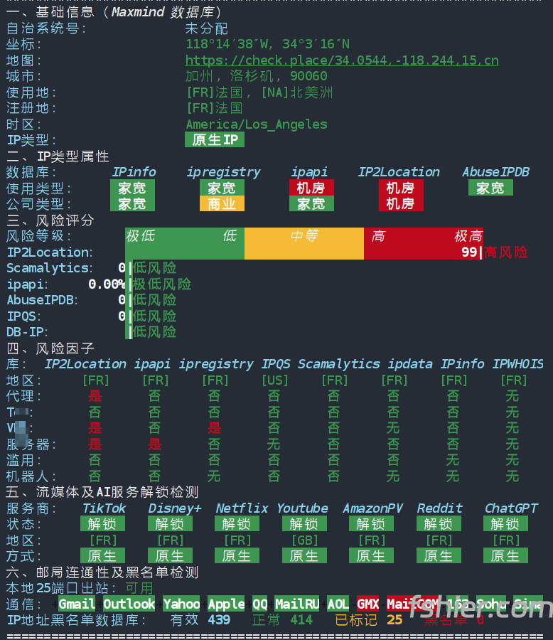 IP为法国原生IP,具有双ISP属性。